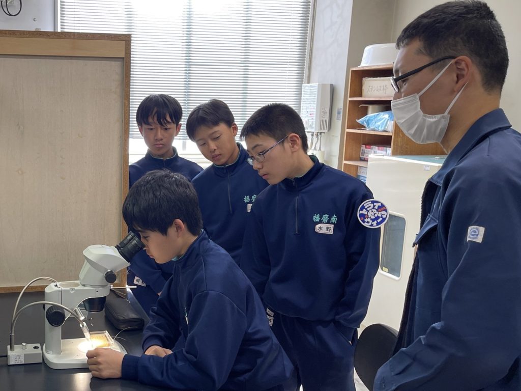 魚類等の水産生物の飼育、校外学習でやってきた小学校5年生70人を相手に、クイズ形式での兵庫県の魚紹介、ワカメ養殖実習、閉鎖循環飼育施設の管理清掃、海洋観測、顕微鏡観察、近くの海の生物生息状況の調査など、さまざまな水産技術センターの仕事をしてくれました。