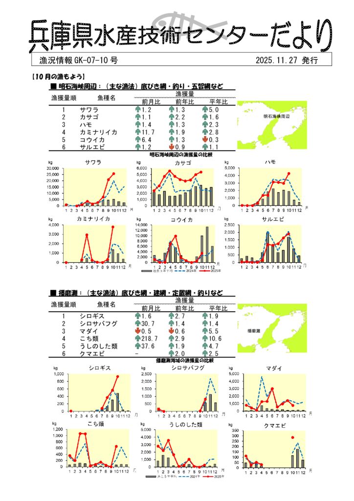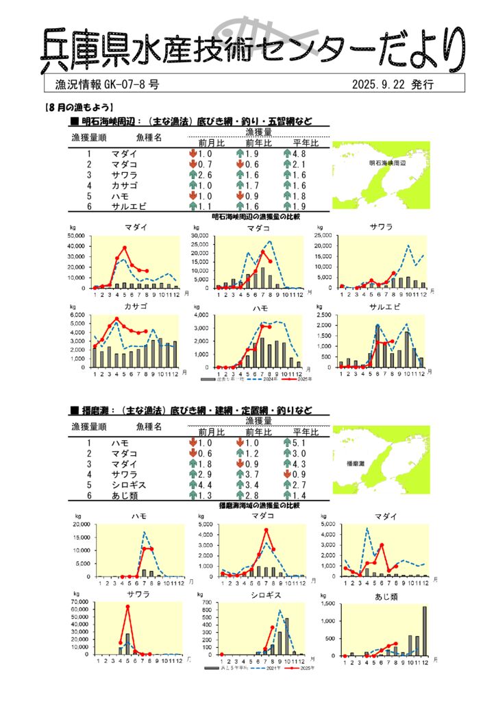 漁況情報とは、兵庫県瀬戸内海地域の主要漁協において、毎月中旬~下旬に漁業種類別魚種別漁獲量の調査を行い、これを整理検討したものです。