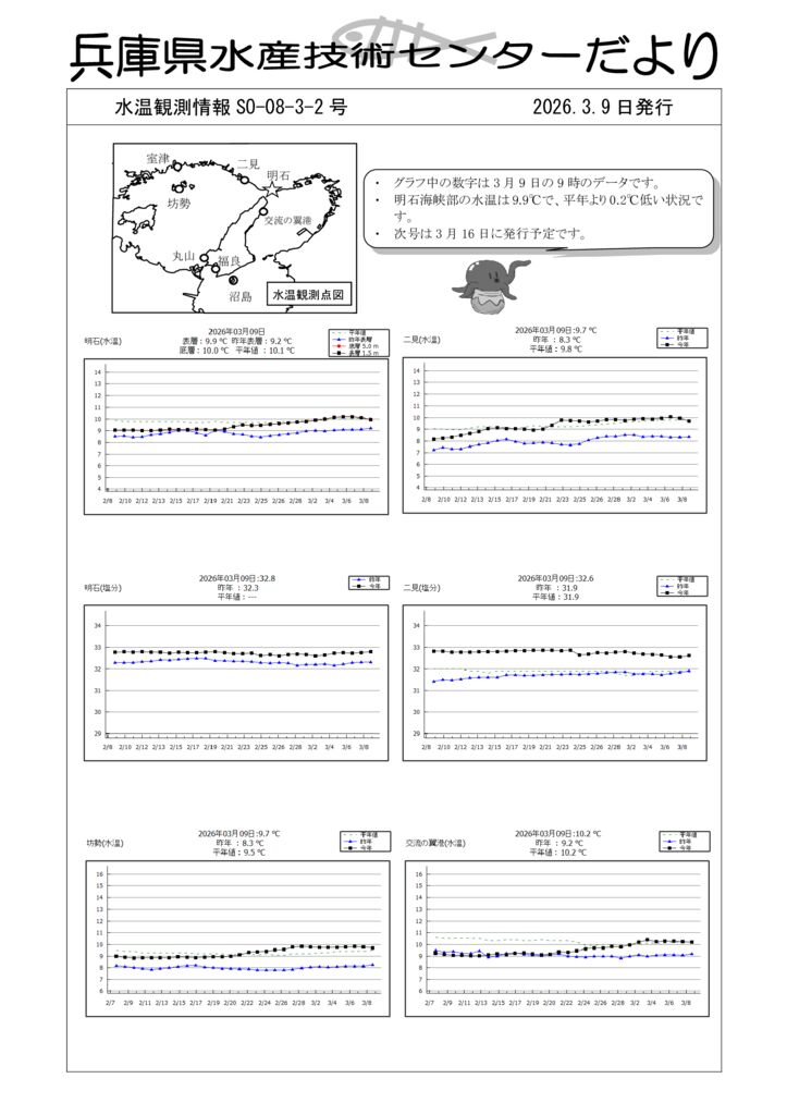 - 明石海峡部の水温は9.9℃で、平年より0.2℃低い状況です。