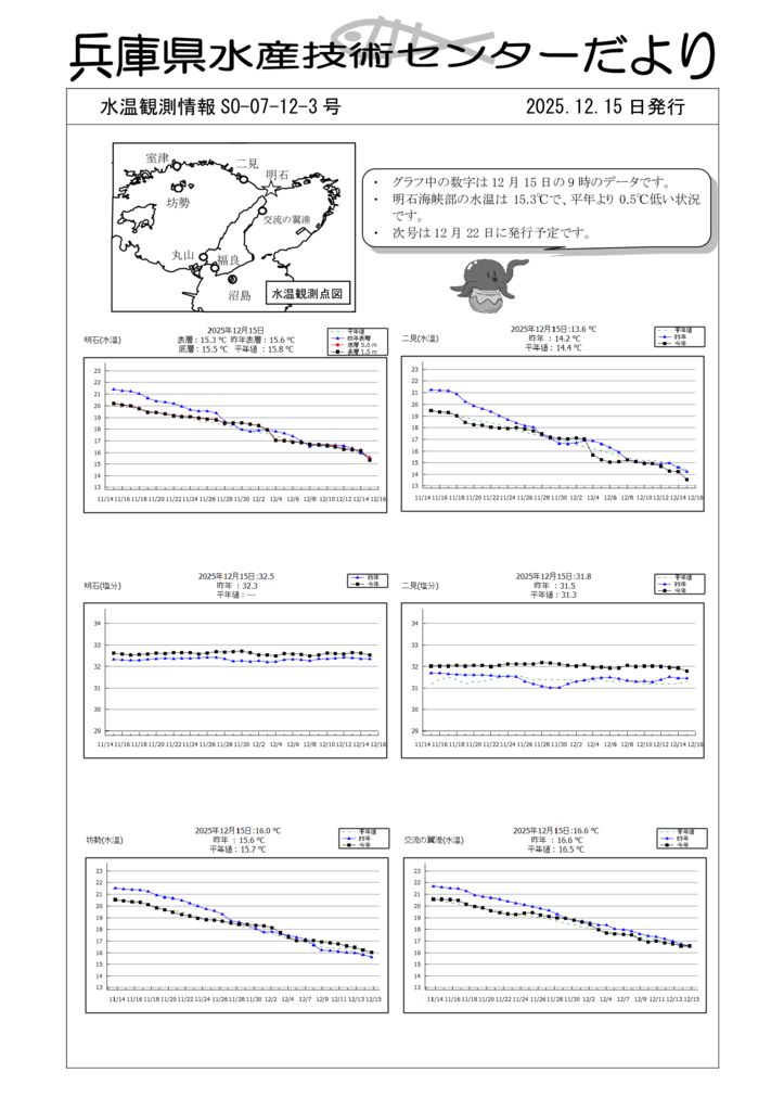 - 明石海峡部の水温は15.3℃で、平年より0.5℃低い状況です。