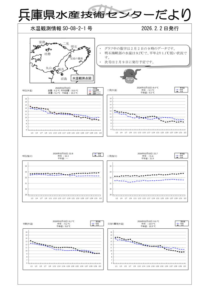 - 明石海峡部の水温は9.2℃で、平年より1.1℃低い状況です。