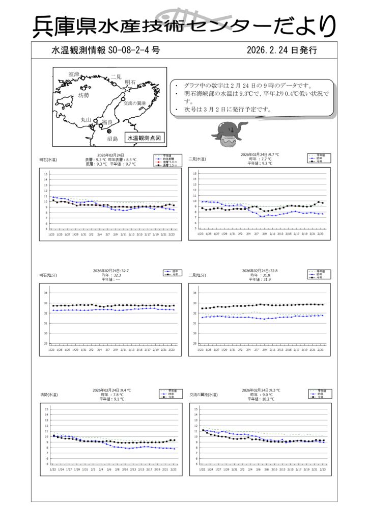- 明石海峡部の水温は9.3℃で、平年より0.4℃低い状況です。