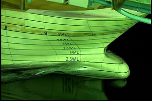 第2回目の耐航性能試験では、波浪を発生させる装置の付いた水槽で船体長の半分程度から2倍程度までの波(規則波)を発生させ、波浪中の船体動揺性能を観測しました。